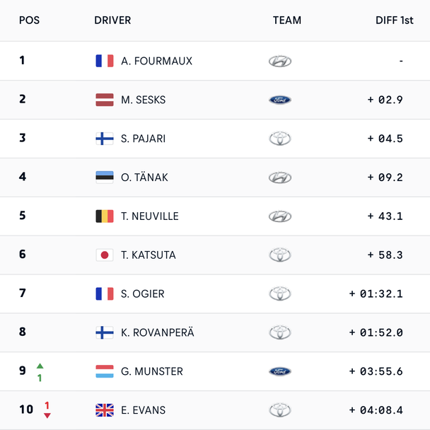 Иначе пред Мюнстер на осмото място се движи аутсайдерът в битката за титлата Кале Рованпера, който с много силно каране сутринта практически стопи наполовина своя пасив от Ожие. Двамата са разделяни от 19.9 секунди, а на свой ред Ожие изостава с 33.8 от Кацута.