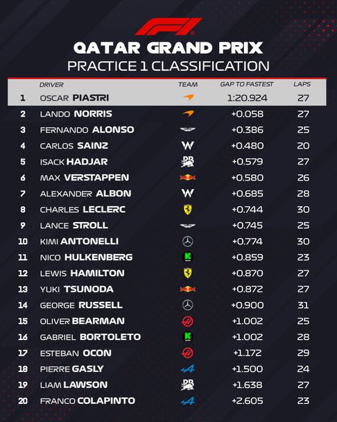 За първи път от началото на октомври месец насам Оскар Пиастри завърши сесия във Формула 1 на първото място, след като даде най-доброто време в единствената тренировка преди Гран При на Катар. Последният случай, в който австралиецът беше над всички, беше по време на втората тренировка преди Гран При на Сингапур в началото на октомври.
