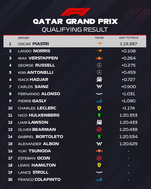 Той стори това с време от 1:19.387 и преднина от 0.108 пред Норис, който все пак ще потегли от първата редица в състезанието, в което ще има първи мачпойнт в битката за титлата. От третата позиция ще стартира третият от претендентите за титлата Макс Верстапен, който беше с 0.264 по-бавен от Пиастри в края на квалификацията.