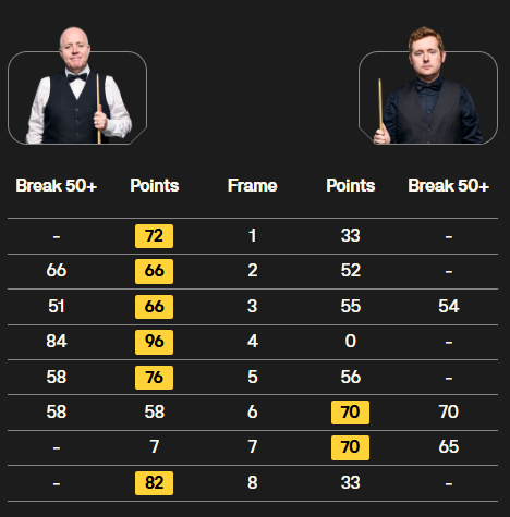 Ууластън обаче показа характер в шестия фрейм. Хигинс първи направи 58, но съперникът разчисти масата със серия от 70 и открадна фрейма на черната топка. След това с 65 свали резултата до 5:2 и оказа натиск. В крайна сметка Хигинс удържа и спечели осмия фрейм след 21-минутна битка.