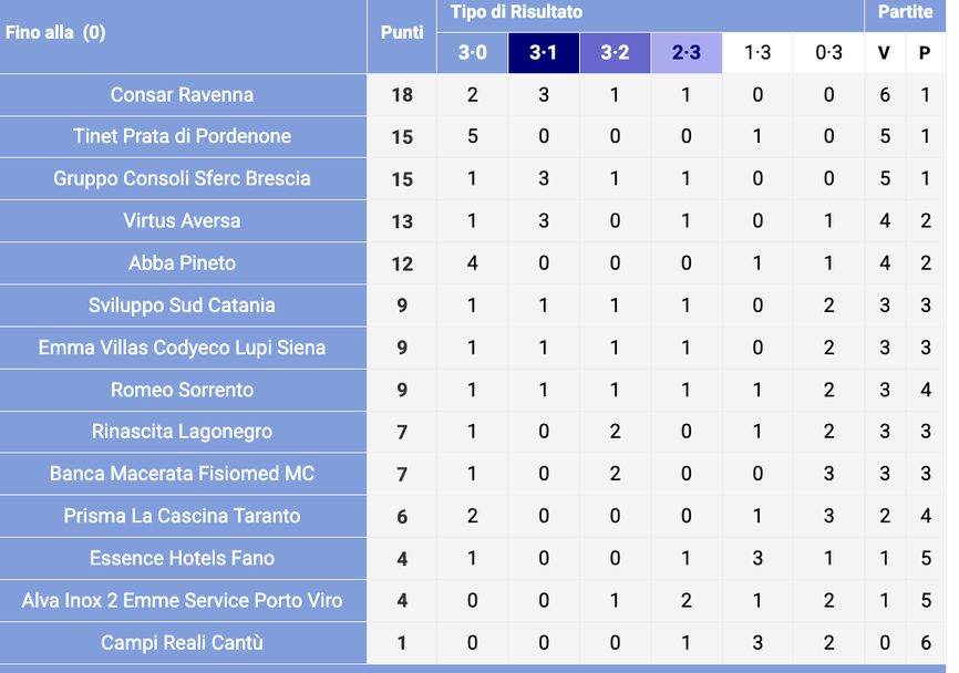 Равена има 18 точки в актива си (6 победи, 1 загуба). По 15 точки имат Тинет Прата ди Порденоне и Групо Конзоли Сферк Бреша, които са съответно втори и трети, но с мач по-малко. Соренто е на осма позиция с 9 точки (3 победи, 4 загуби).