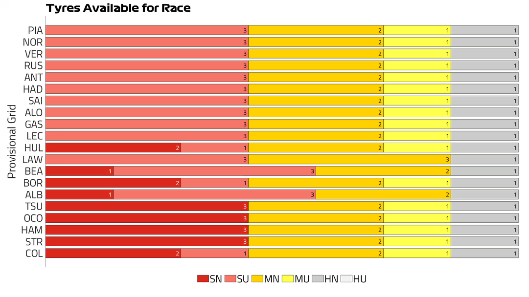 От гледна точка наличните гуми, абсолютно всички пилоти имат по един комплект чисто нови твърди гуми, които могат да има бъдат много полезни. Лиам Лоусън, Оливър Беарман и Алекс Албон пък са единствените трима пилоти, които нямат налични чисто нови средни гуми и ще трябва да разчитат само на вече използвани сликове от този тип.