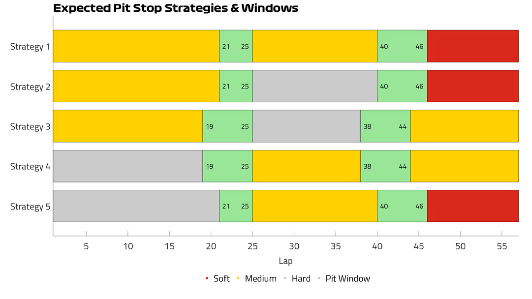 Данните, които Пирели събра от началото на уикенда показват, че най-добрият вариант за провеждане на състезанието включва две по-дълги серии със средно твърдите гуми и един финален къс спринт с меките. Алтернативно вторият стинт може да бъде направен с твърдите сликове преди отново да се завърши с меките. Съществуват и други варианти за покриване на дистанцията, включващи само двата по-твърди модела гуми, а всички тях може да видите на прикачената снимка.