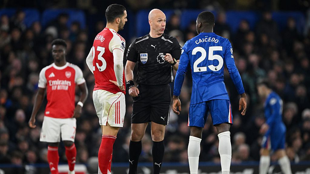 Точно след половин час игра Жоао Педро успя да отнеме в невралгичната зона на дъгата, но опитът му да стреля не се получи. Минута след това нова бърза атака на Челси завърши с хубав удар на Енцо Фернандес, но той не представляваше проблем за Давид Рая. В 33-ата минута Марк Кукурея извърши ново нарушение срещу Сака и от Арсенал веднага поискаха червен картон за испанеца. В 35-ата минута Мойсес Кайседо влезе много остро в глезена на Микел Мерино. Реферът Антъни Тейлър бе привикан от ВАР да прегледа отново ситуацията и това доведе до червен картон на дефанзивния халф на домакините.
