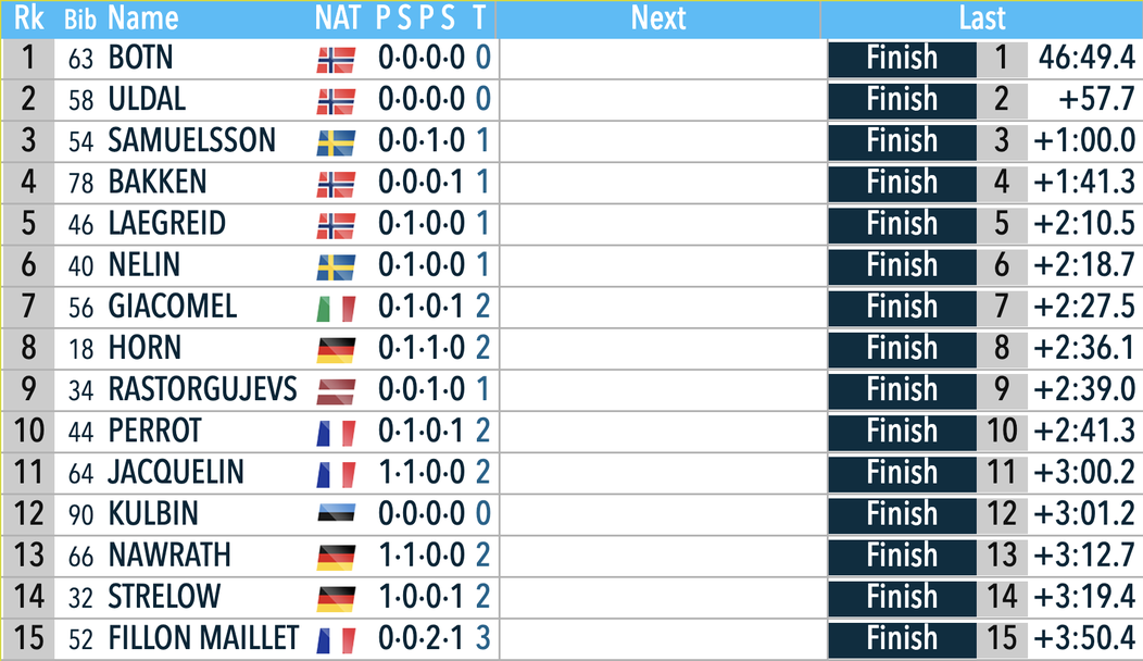 Още два норвежци Сиверт Гуторм Бакен и Стурла Холм Лагрейд завършиха четвърти и пети, като и двамата направиха по един пропуск в своите стрелби. Те изостанаха на съответно 1:41.3 и 2:105 от победителя, но това масивно присъствие на норвежци в топ 5 показва, че Викингите не усещат много загубата на братята Бьо, които се оттеглиха от спорта в края на миналия сезон.