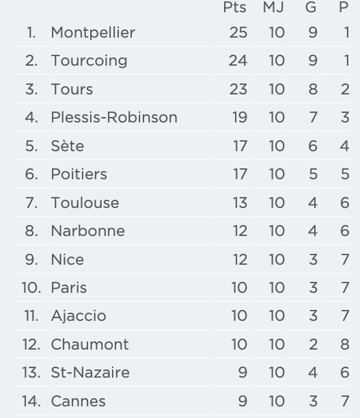 Туркоа продължава да е втори с 9 победи, 1 загуба и 24 точки. Лидерът Монпелие има точка повече, а трети е шампионът Тур с 23 точки.