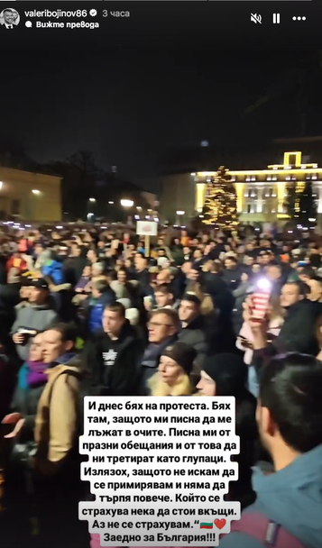 „И днес бях на протеста. Бях там, защото ми писна да ме лъжат в очите. Писна ми от празни обещания и от това, да ни третират като глупаци. Излязох, защото не искам да се примирявам и няма да търпя повече. Който се страхува, нека си стои вкъщи. Аз не се страхувам. Заедно за България“, написа Божинов към видеото.