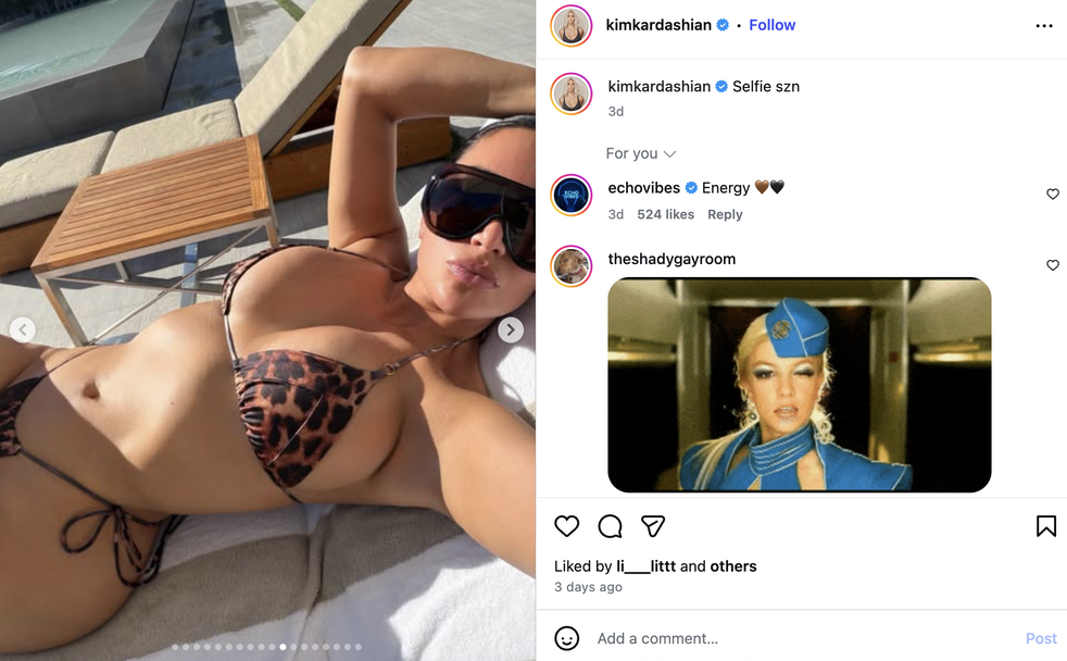 Риалити звездата позира в мини бански с леопардов принт, който вади почти всичко от пищното й тяло на показ. Постът й в Инстаграм се радва на сериозен брой лайкове от нейните 354 млн. последователи там.