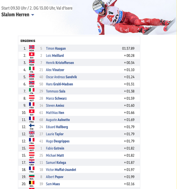 Трети във Вал д'Изер се нареди още един норвежец Хенрик Кристоферсен, на 0.34 секунди от победителя.