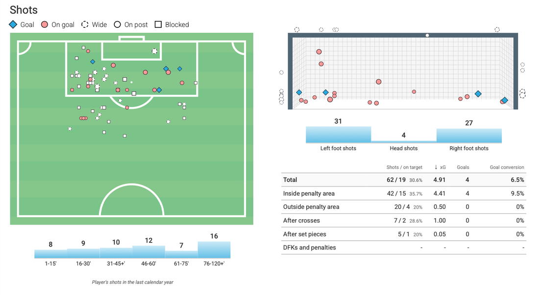 По отношение на участието в атаките, Перейра е активен и при завършването. Той отправя 2.58 удара на мач, като голяма част от тях идват от наказателното поле. Добавя и солиден брой от центрирания (3.16 на 90 минути), като комбинира високи топки и подавания по земя, което го прави трудно предвидим за защитата. И именно тук обаче се появява основната слабост в играта му – ефективността пред гола. Въпреки честите удари, Перейра има едва 6.5% реализация, като е отбелязал 4 гола от 4.91 очаквани (xG) до момента в сезона. Липсват голове извън наказателното поле, което пък е един от специалитетите на “червените” футболисти през тази година, така че това едва ли ще е чак такъв проблем за Христо Янев. От друга страна пък статистиката сочи, че Перейра стреля успешно и с двата крака, макар и десният да е по-силният му. Фактът, че играе повече по левия фланг, пък го прави и по тази линия по-трудно разгадаем за съперника.