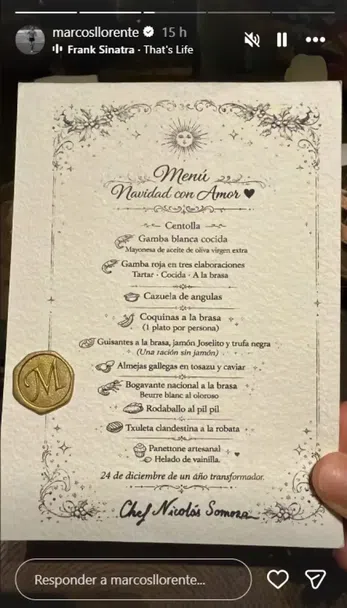 Менюто представляваше истински парад от деликатеси: кралски рак, варени бели скариди, червени скариди, приготвени по три начина, ястие със змиорки, миди на скара, грах на скара, хамон Joselito с черен трюфел, галисийски миди в сос тосазу с хайвер, омар на скара, калкан „ал пил пил“, телешки стек „чулета“ на робата и за десерт – занаятчийски панетоне.