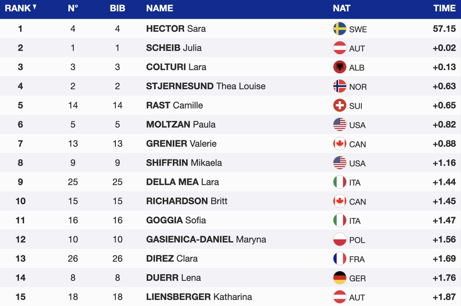 Олимпийската шампионка в дисциплината от Пекин 2022 оглави класирането с време от 57.15 секунди и аванс от само 0.02 пред представителката на домакините от Австрия Юлия Шайб. Тройката с пасив от 0.13 оформи състезаващата се за Албания италианка Лара Колтури.