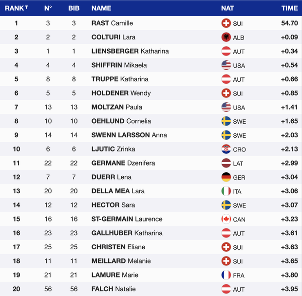 В челото на класирането световната шампионка в дисциплината Камий Раст от Швейцария поведе с време от 54.70 секунди и аванс от 0.09 секунди пред Лара Колтури от Албания. Световната шампионка от 2021 година Катарина Лийнсбергер (Австрия), която откри състезанието, се класира трета на 0.34 от първото място, а победителката от първите четири слалома за сезона Микаела Шифрин (САЩ) остана четвърта на 0.54 от водачката.
