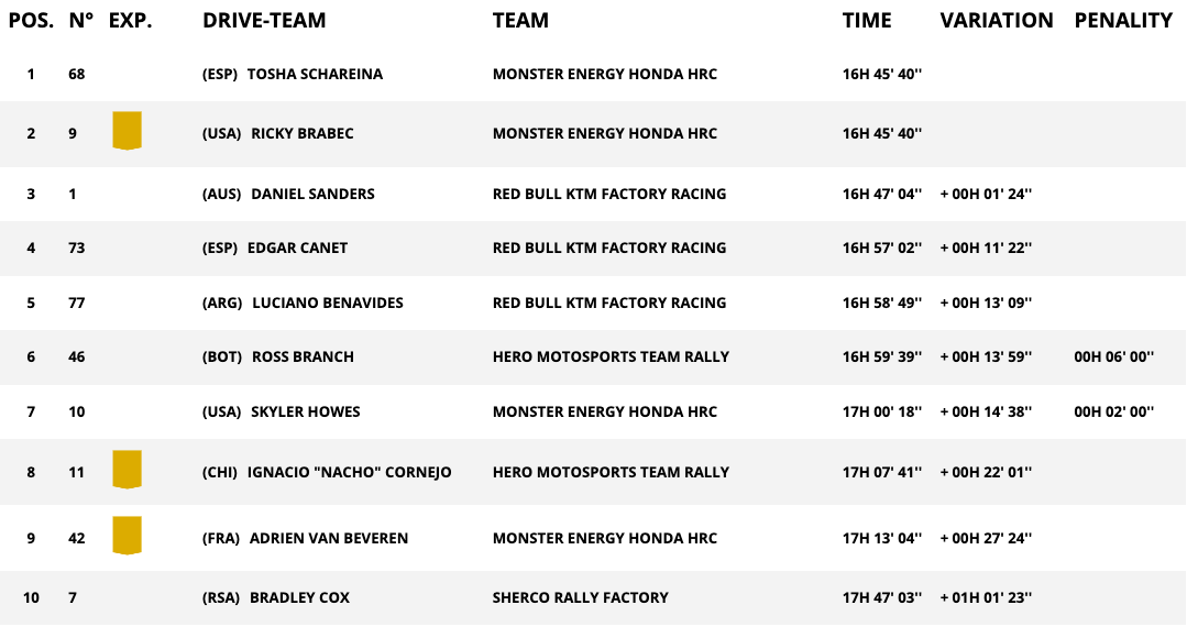 В генералното класиране Шарейна става третият различен лидер от началото на рали „Дакар“ след Едгар Канет (КТМ) и Сандърс. Испанският пилот на Хонда оглавява подреждането с равно време с Брабек, който е втори, а тройката на 1:24 зад тях оформя Сандърс.