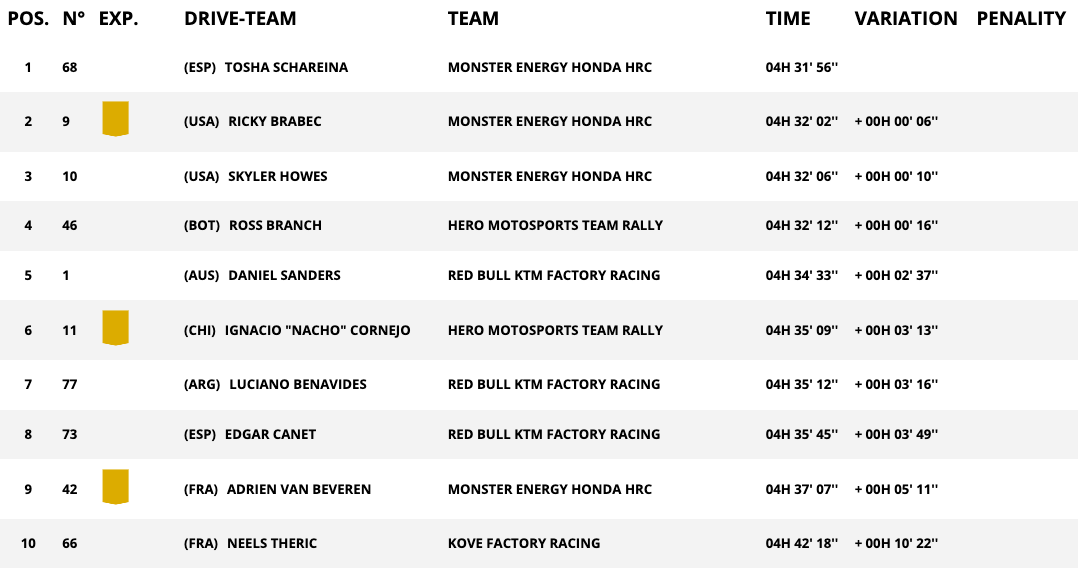 Зад триото на Хонда се нареди Рос Бранс с Херо, а едва пети остана Дениъл Сандърс с КТМ, който изостана на цели 2:37 минути от Шарейна. Като цяло днешният ден беше доста слаб за пилотите на КТМ, които загубиха много време в първата половина на етапа преди да наваксат част от изоставането си във втората му половина.