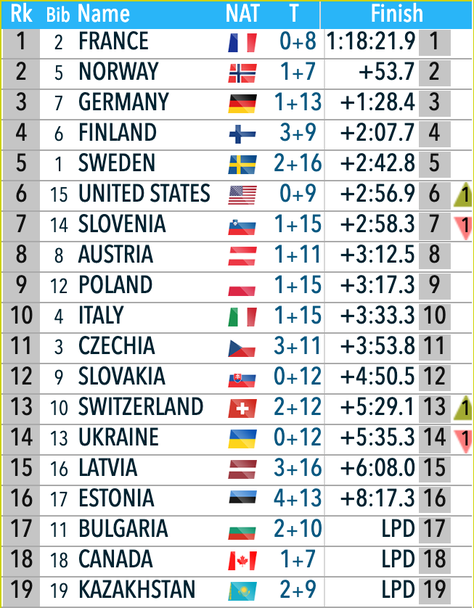 На щафетата на Франция спечели с аванс от 53.7 секунди пред норвежкия състав (Марте Кракстад Йохансен, Ингрид Ландмарк Тандреволд, Каролин Кнотен и Марен Киркайде), който завърши с 1+7. Авансът на французойките в началото на последната обиколка беше над 1:10 минути, но очаквано Симон върна темпото, което позволи на Киркайде да ѝ стопи близо 20 секунди.