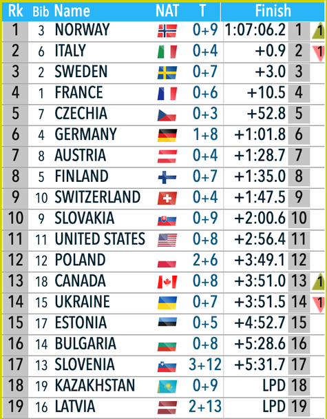 Най-силно на стрелковия рубеж днес се представиха биатлонистките на Чехия, които имаха нужда от само три допълнителни патрона, за да повалят своите 40 мишени, което позволи на чехкините да завършат на петото място за квартета на Франция, който остана четвърти. Победителките от Норвегия завършиха с 0+9, Италия с 0+4, а Швеция с 0+7.