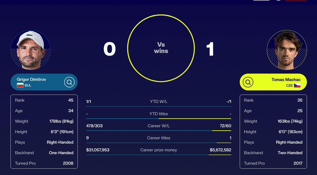 25-годишният чех в момента заева 35-о място в световната ранглиста или 10 места преди Григор. Съперничеството между най-добрия български тенисист и чешкия му колега включва само един мач до момента. На осминафиналите във Виена през 2024 година Махач надделя над Григор след обрат с 6:7(5), 6:4, 6:3.