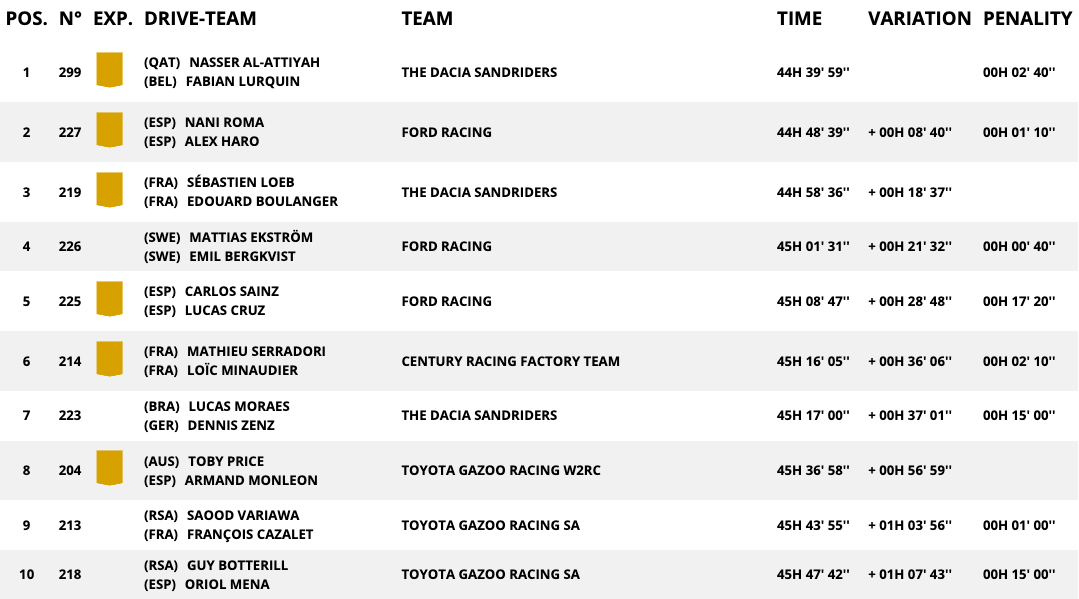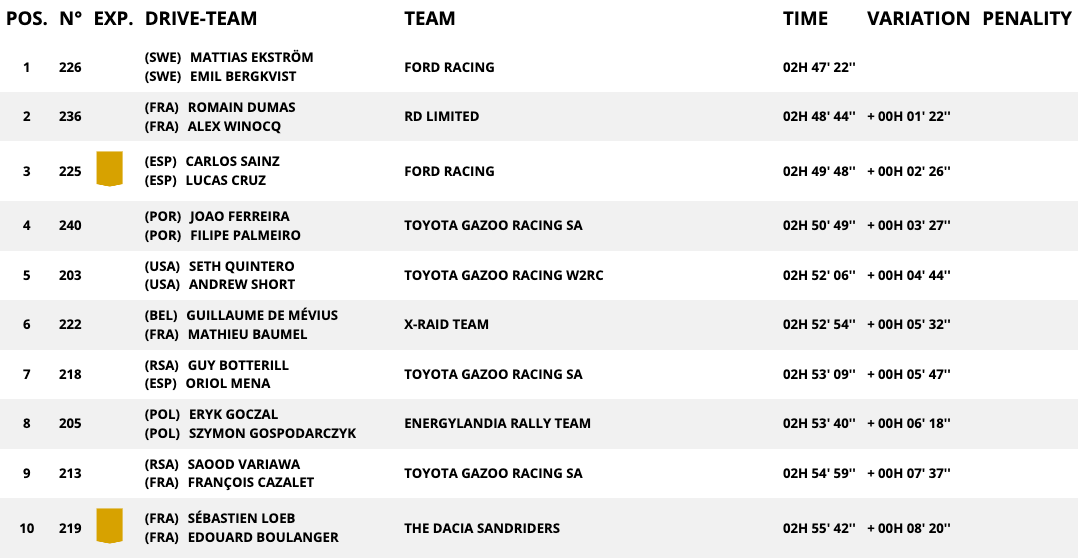 Иначе в челото видяхме окупация от страна на Форд, след като Матиас Екстрьом, частникът Ромен Дюма и Карлос Сайнц заеха първите три позиция. Екстрьом завърши етапа за 2:47:22 часа и изпревари с 1:22 минути Дюма, а Сайнц завърши на 2:26 зад шведа. Зад тях в петицата влязоха още Жоао Ферейра (Тойота) и Сент Кинтеро (Тойота), които изостанаха със съответно 3:27 и 4:44 от днешния победител.