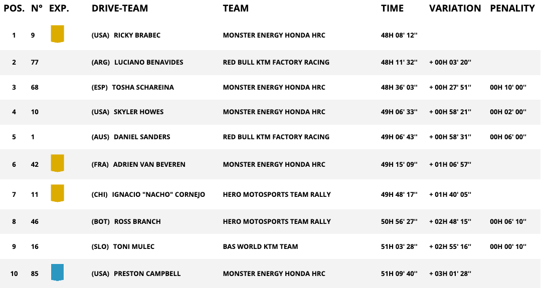 В генералното класиране преди финалния етап на ралито Брабек води с 3:20 пред Бенавидес, което прави американеца основен фаворит за победата. Трети и в генералното класиране също е Шарейна, който обаче изостава с цели 27:51 от лидера.