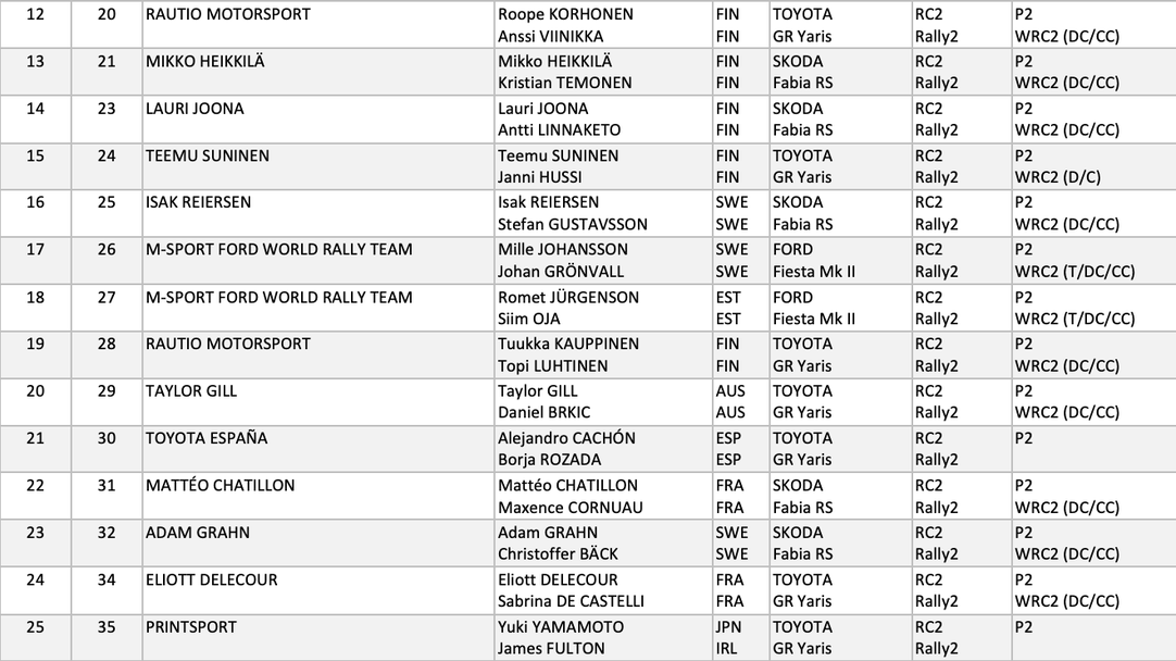 Въпреки това Тойота отново ще има пет коли, които ще бъдат поверени на титулярите Елфин Еванс, Оливър Солберг, Такамото Кацута и Сами Паяри. Към тях ще се присъедини и главният изпълнителен директор на модната империя на Prada Лоренцо Бертели, който за поредна година ще стартира в рали „Швеция“.