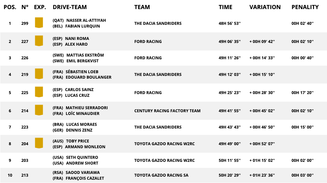 Катарският пилот на Дачия направи едни консервативни финални 105 състезателни километра, но това му беше напълно достатъчно, за да спечели цялостната победа. Втори на 9:42 минути зад Ал-Атия завърши Нани Рома от М-Спорт, а тройката след победата си във финалния етап оформи Матиас Екстрьом с М-Спорт.