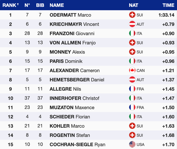 Трети днес завърши вчерашният победител Джовани Францони (Италия), който изостана с 0.90 от Одермат. На под секунда от швейцареца завършиха още световният шампион в дисциплината Франьо фон Алмен (Швейцария), Алекси Моне (Швейцария) и Доминик Парис (Италия). Зад тях челната десетка допълниха Камерън Алекзандър (Канада), Даниел Хемцбергер (Австрия), Нилс Алегре (Франция) и Кристоф Инерхофер (Италия).