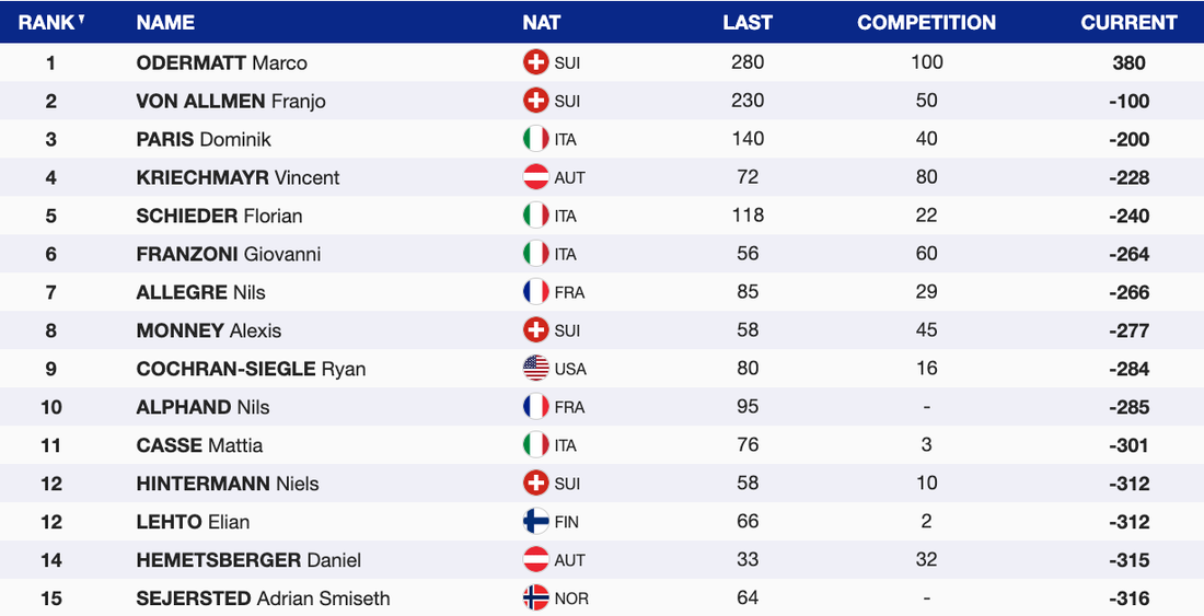 С третата си победа в общо четири спускания от началото на сезона Одермат увеличи своя аванс на върха на класирането в дисциплината, в което с актив от 380 точки той води с точно 100 пред Фон Алмен. Трети с пасив от 200 пункта се движи италианецът Парис.