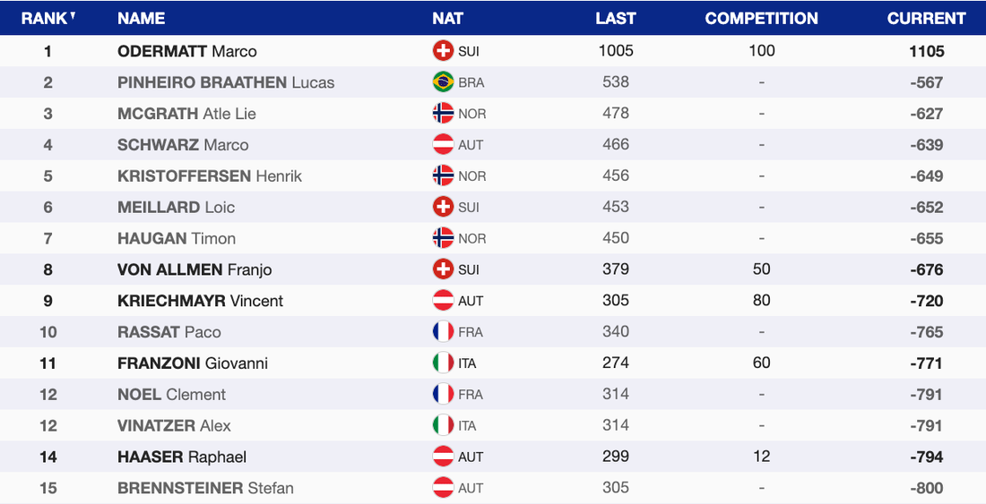 В генералното класиране за Световната купа с актив от 1105 точки Одермат има комфортен аванс от 567 пункта пред Лукас Пинейро Бротен (Бразилия), а тройката с пасив от 627 оформя норвежецът Атле Лий Макграт.