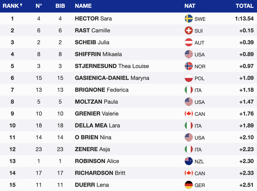 Олимпийската шампионка в дисциплината от Пекин 2022 оглави класирането с време от 1:13.54 и аванс от 0.15 пред Камий Раст (Швейцария). Трета с изоставане от 0.39 се нареди водачката в класирането в дисциплината гигантски слалом през сезона Юлия Шайб (Австрия).