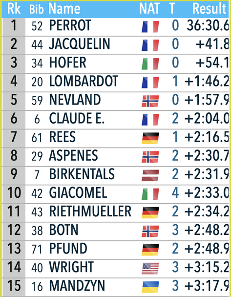 Световният шампион в дисциплината от миналата година стигна до успеха днес след перфектна стрелба и много силно ски бягане по дистанцията. Така той победи с цели 41.8 секунди своя съотборник във френския отбор Емилиян Жаклен, който оформи двойния триумф на „петлите“ днес, след като и той повали всичките си 20 мишени.
