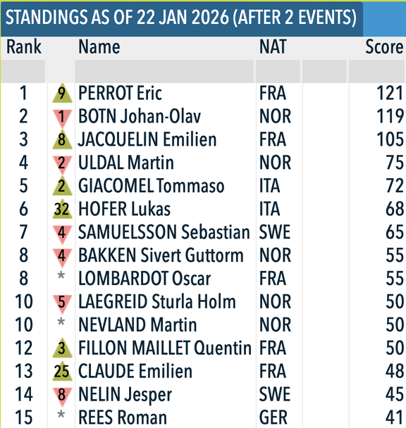 С победата си днес Перо повежда в класирането в индивидуалната дисциплина със 121 точки и аванс от два пункта пред норвежеца Йохан-Олав Ботн, който се завърна в Световната купа с 12-то място. Трети на 16 точки от лидера в класирането е вторият от старта в Чехия Жаклен.