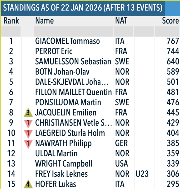 В генералното класиране за Световната купа лидер с актив от 767 точки остава завършилият на десетото място днес Томазо Джакомел (Италия), който води с 23 пункта пред Перо. Тройката с пасив от 127 точки оформя шведът Себастиан Самуелсон, който след осем пропуска остана едва 73-ти днес.