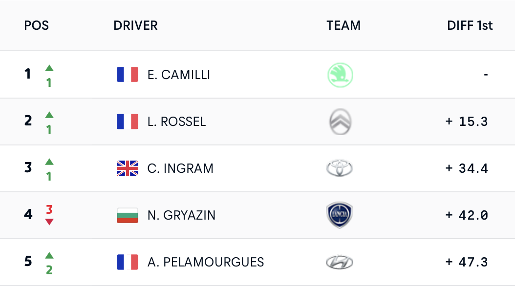 След тази своя неточност Грязин загуби над 40 секунди и така се смъкна с три места в класирането в WRC2, в което той изостава с 42.0 секунди от лидера Ерик Камий (Шкода). Втори с пасив от 15.3 спрямо французина се движи Лео Росел (Ситроен), а тройката с изоставане от 34.4 оформя Крин Инграм (Шкода).