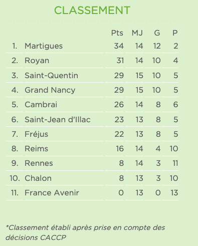 Гран Нанси е четвърти във временното класиране с актив от 29 точки (10 победи, 5 загуби).