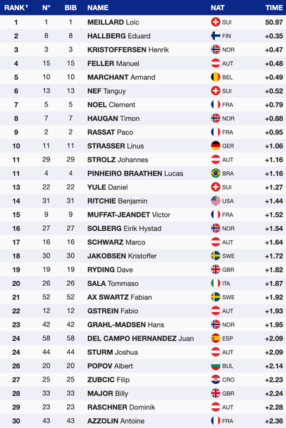 Иначе в челото световният шампион поведе с 0.35 пред Едуард Халберг (Финландия) и с 0.47 пред Хенрик Кристоферсен (Норвегия). Водачът в класирането в дисциплината слалом Атле Лий Макграт (Норвегия) не стигна до финала на първия манш след грешка в началните врати на трасето.