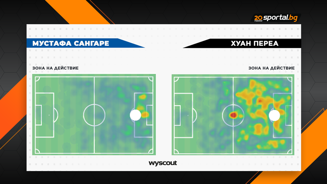 Зоните на действие на двамата разкриват голяма разлика в техния стил на движение. Присъствието на Мустафа Сангаре е концентрирано в самото наказателно поле и по фланга, където често използва скоростта си за пробиви.