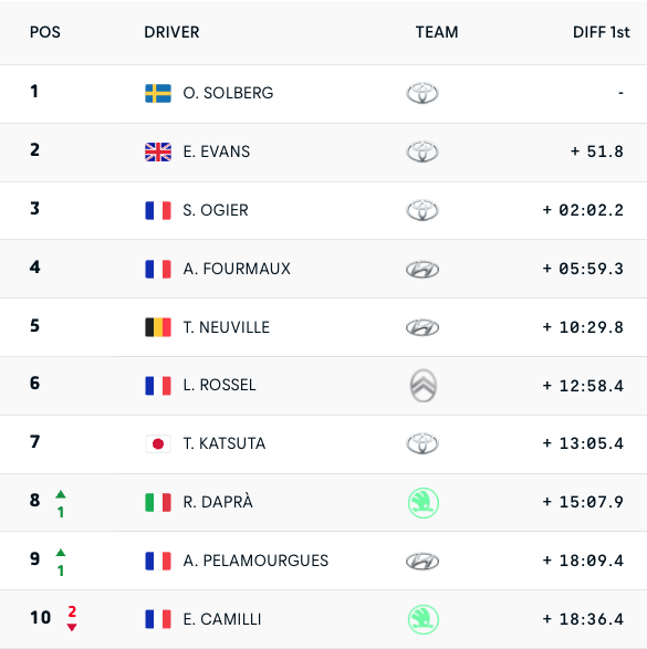 На отличната шеста позиция се класира победителят в WRC2 Лео Росел със Ситроен, който се възползва от проблемите на пилотите в Rally1, за да завърши в подножието на челната петица. На финала французинът изпревари със само 7.0 секунди Такамото Кацута (Тойота), а зоната на точките допълниха Робето Дапра (Шкода), Артур Пеламор (Хюндай) и Ерик Камий (Шкода), които също карат в WRC2.
