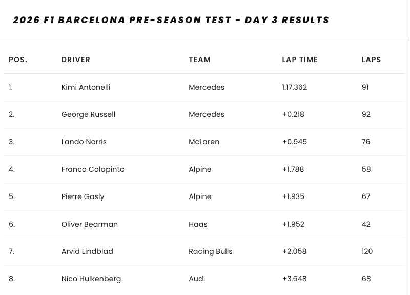 Третото място в края на деня зае световния шампион Ландо Норис, който изкара цял ден зад волана на Макларън MCL40, правейки общо 76 обиколки. В най-бързия си тур Норис беше с 0.945 по-бавен от Антонели, като единствен той записа пасив от по-малко от секунда спрямо дуото на Мерцедес.
