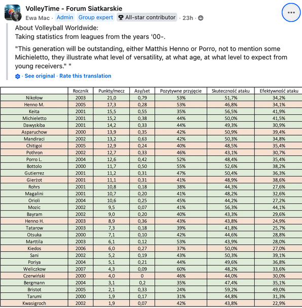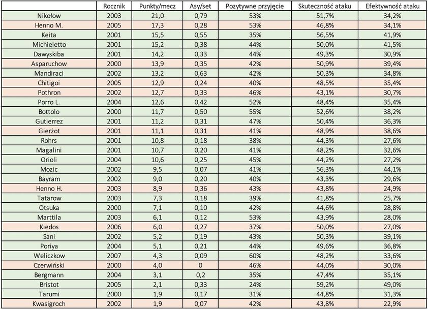 Аспарух Аспарухов, който през този сезон играе отлично за полския Шлепск Малов Сувалки е на престижната 6-а позиция с 13,9 точки (0,35 точки на гейм, 42% позитивно посрещане, 30,9% успеваемост в атака и 49,3% ефективност в атака).