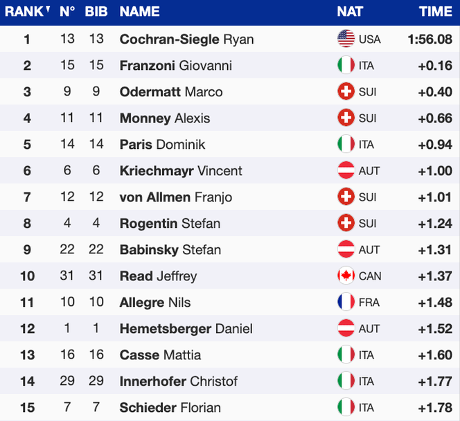 Американецът завърши своето спускане по пистата „Стелвио“ в Бормио за 1:56.08 и по този начин изпревари с 0.16 секунди новата звезда в скоростните дисциплини на домакините от Италия – Джовани Францони. Трети на 0.40 зад Кохрън-Сийгъл се нареди Марко Одермат, а зад него четвърти и пети се класираха сънародникът му Алекси Моне и най-успешният скиор в спускането на „Стелвио“ Доминик Парис от Италия.