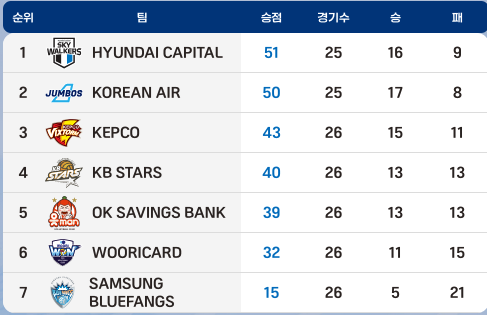 Бусан е 5-и във временното класиране с актив от 39 точки (13 победи, 13 загуби).