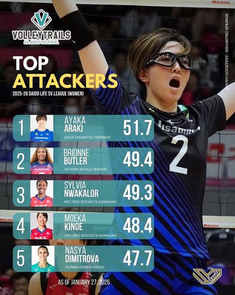 Нася Димитрова, която пък играе за Гънма Грийн Уингс, е пета сред нападателите, със средно 47,7% ефективност. Начело в тази класация е Аяка Араки от Сага Хисамитсу Спрингс с 51,7%.