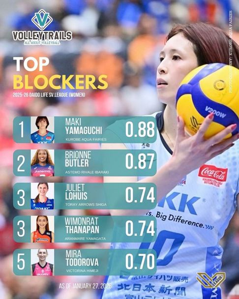 Мира Тодорова е в Топ 5 на блокировачите в първенството. 31-годишната състезателка на Викторина Химеджи е реализирала средно 0,70 точки от блокада. Лидер е Маки Ямагучи от Куробе Акуа Фейрис Тояма с 0,88 точки.