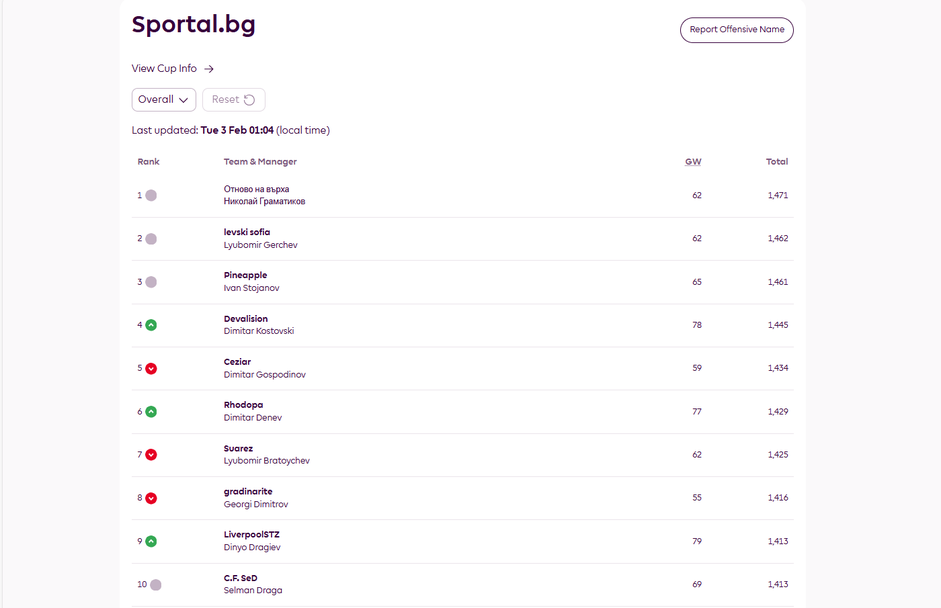 Разговорът обхвана и по-широката картина във Фентъзи Премиър лийг – кои отбори се намират в най-добра позиция спрямо предстоящите мачове, къде се крият потенциалните „диференшъли“ и кои играчи са най-подходящи за капитанската лента в идния кръг. Както винаги, акцентът бе върху баланса между сигурните избори и рисковите ходове, които могат да донесат сериозен скок в класирането. В края на предаването отново бе отправено и напомняне към всички участници в мини-лигата на Sportal.bg. Победителят в крайното класиране след последния кръг на сезона ще получи специална награда – оригинална фланелка на любимия си отбор, което прави битката за челните места още по-оспорвана.