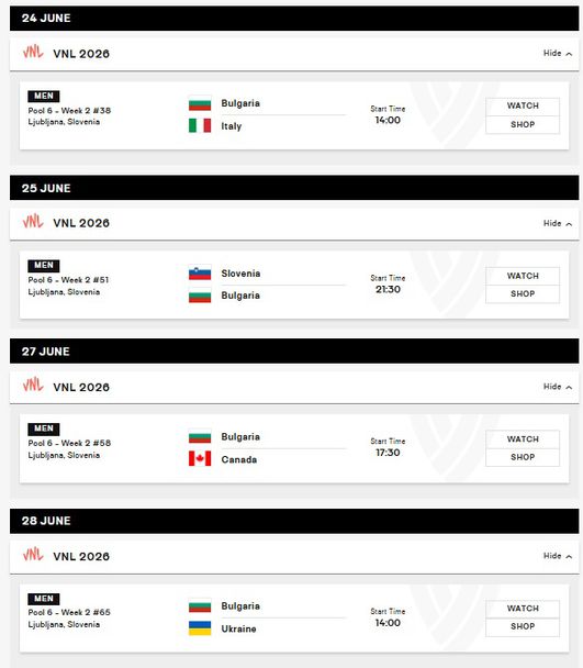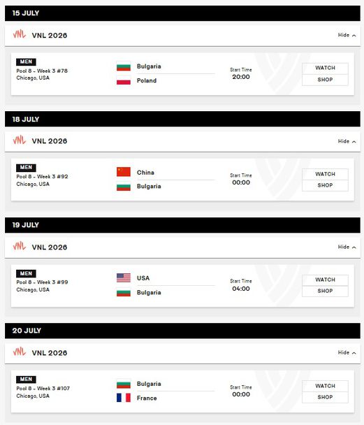 Пълна програма на България във Волейболната Лига на нациите 2026 при мъжете: