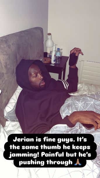 „Джериън е добре, хора. Това е същият палец, който постоянно го боли! Боли го, но се бори“, написа Емили Грант, публикувайки снимка, на която ръката на играча е превързана.