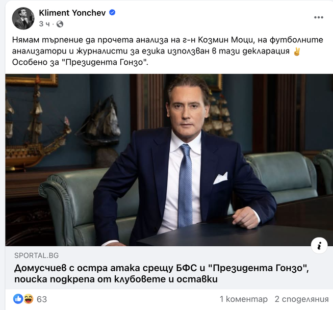 „Нямам търпение да прочета анализа на г-н Козмин Моци, на футболните анализатори и журналисти за езика, използван в тази декларация. Особено за „Президента Гонзо“, написа Йончев в профила си във Facebook.
