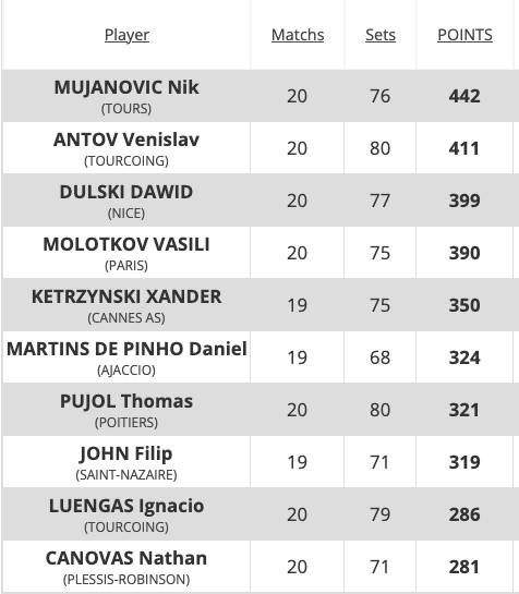 Трети е полякът Давид Дулски от Ница с 399 точки, а реализатор №1 на миналия шампионат на родната efbet Супер Волей Василий Молотков (Пари Волей) е четвърти с 390 точки.