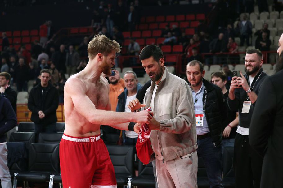 Новак Джокович присъства на мача между Олимпиакос и Цървена звезда тази вечер в "Двореца на мира и приятелството" в Пирея, където шампионите на Гърция, водени от Александър Везенков, надделяха с 92:86 в среща от 28-ия кръг на Евролигата.